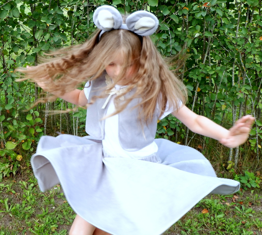A mouse costume for girls is made from soft velboa and consists of a skirt, tail, vest, ears headband.